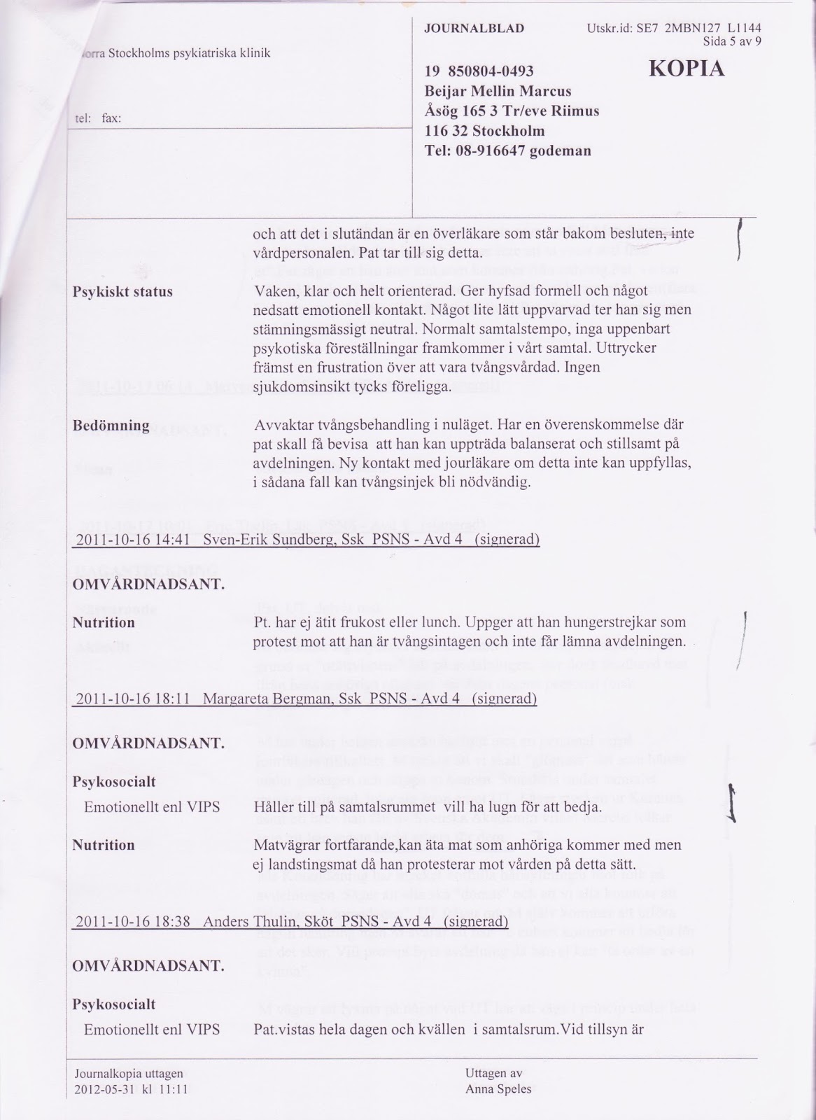 ’nej då… - jag är lugn… ’ svarade han kallt - de ledde honom in - ett team - väntade innanför dörren när han kom in, sa han ljudligt ’mitt namn - är Nils Kovacs mitt personnummer är …’ när de tog loss handbojorna - tog fyra starka ”vårdare” tag i honom - &- tryckte ned honom på bältessängen - som stod färdig - de spände fast honom - han kunde inte se annat - än den vita kudden - efter ett tag - kom en sköterska in - hon sa- att hennes namn var Anna - sedan - mindes han bara - att han lugnt låtit dem ta av overallen …- &-sedan stack det till i skinkan - liksom av kramp -han förlorade nästan medvetandet, en till spruta, stacks så in… han vaknade bara till när - det stack till - en gång till… - han visste inte hur lång tid som förflutit… -
